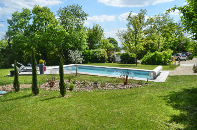 Le gîte, Les extérieurs La piscine Vous bénéficiez d’un accès à la piscine propriétaire chauffée (10m x 4m avec volet roulant) et de sa grande terrasse en ipé équipée de transats, de parasols et d’un barbecue. La piscine Image 3 parmi 5
